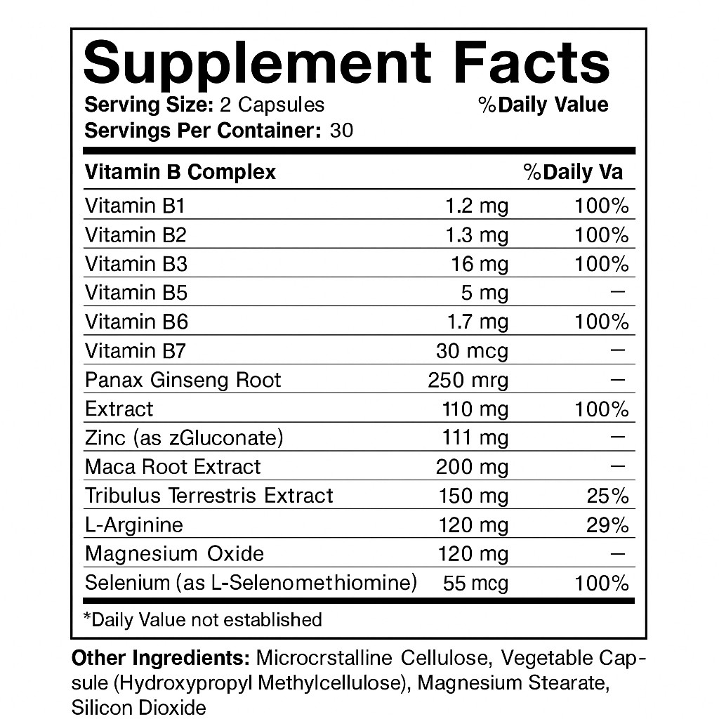 To complement these nutrients, Maca Root Extract and Tribulus Terrestris are added to promote hormonal balance and endurance. Magnesium Oxide assists in muscle recovery and helps regulate nerve impulses, while Selenium contributes antioxidant support that may protect cells from oxidative stress. L-Arginine, a nitric-oxide precursor, supports circulation and performance by helping transport oxygen to muscles more efficiently.
